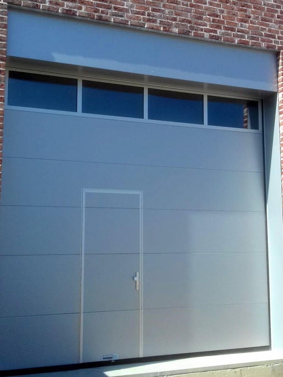 Industriesektionaltor mit Schlupftüre und individuell angefertigter Verblendung